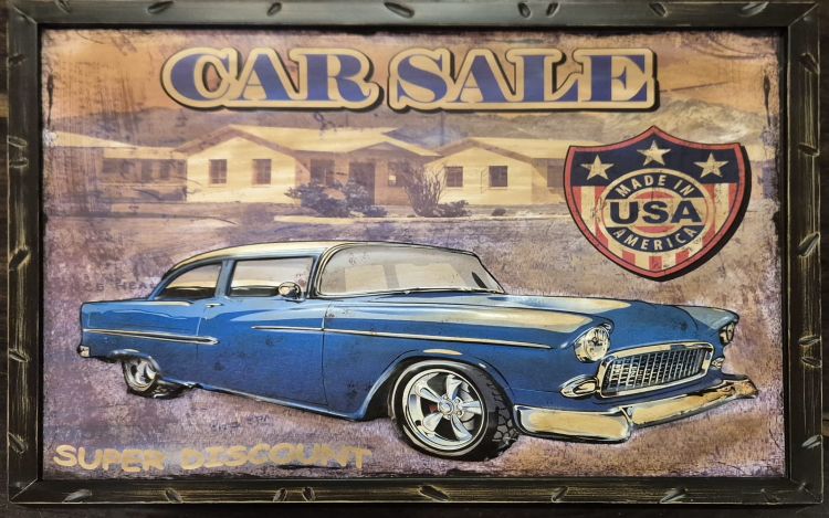 This piece is not just wall art—it’s a conversation starter. The embossed metalwork adds depth and character, while the retro car print offers a nostalgic throwback to a golden era of motoring.